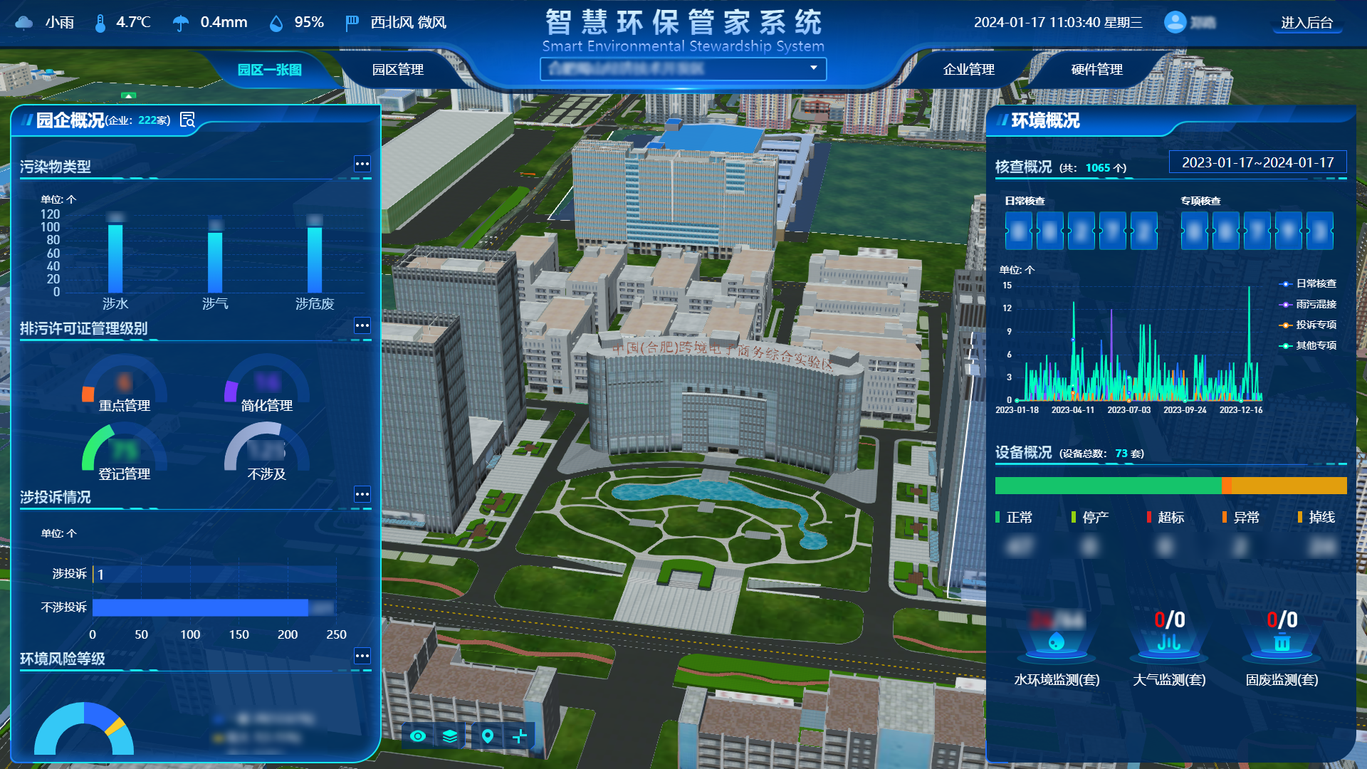 此業(yè)務(wù)板塊包括:結(jié)合《安徽省“十四五”生態(tài)環(huán)境保護(hù)規(guī)劃》、《安徽省“十四五”生態(tài)環(huán)境保護(hù)規(guī)劃》,推動(dòng)建立面向中小企業(yè)線上線下環(huán)保綜合服務(wù)平臺(tái)、構(gòu)建智慧高效的生態(tài)環(huán)境管理信息化體系。 現(xiàn)自主研發(fā)產(chǎn)品包括智慧園區(qū)平臺(tái)、工業(yè)污水處理數(shù)字化監(jiān)管平臺(tái)、數(shù)字孿生流域防洪系統(tǒng)、小微企業(yè)危險(xiǎn)廢物管理平臺(tái)等。